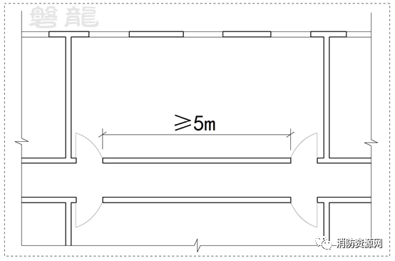 需要設置不少于兩個疏散門的房間(參5.5.15),相鄰兩個疏散門zui近邊緣之間的水平距離不應小于5m。(圖示1)