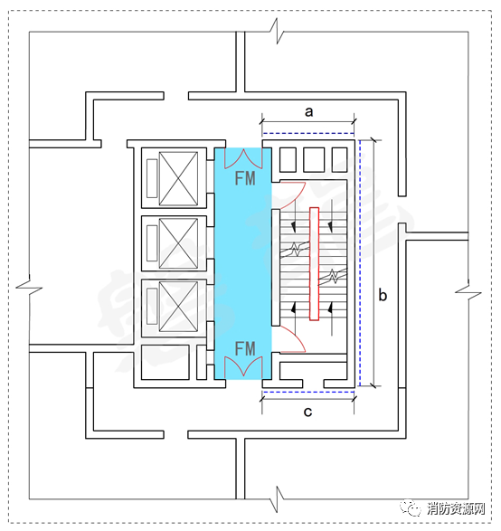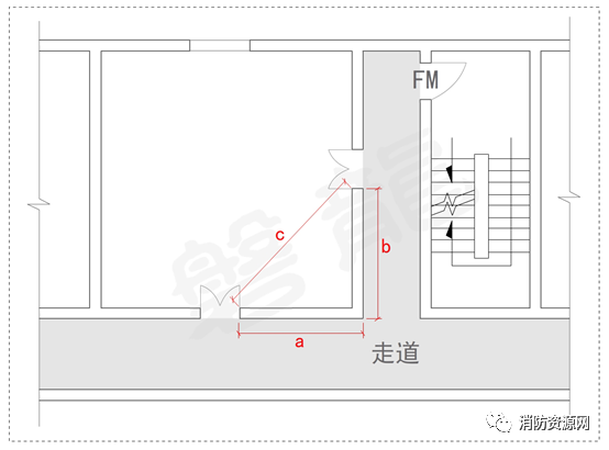 2、對于疏散走道上的疏散出口(安全出口),通常沿疏散走道計算(參圖示3、圖示4)。對于彎折的疏散走道,當隔墻可以遮擋空間上的火焰輻射時,可沿疏散走道方向累計計算安全距離,圖示6中,兩個安全出口的距離為a+b+c。
