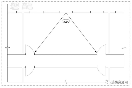1、在一些人員密集場所或布局比較特殊的場所,不僅僅要滿足5米間距要求,同時應考慮疏散夾角的要求,比如:同一房間zui近2個疏散出口與室內(nèi)zui遠點的夾角不應小于45°。(圖示5)