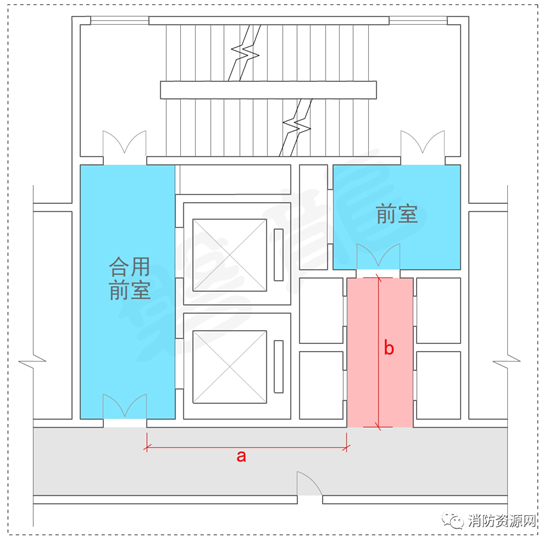 2、在圖示8中,右向安全出口帶短走道,過道入口為必經(jīng)之處,在計算zui近邊緣之間的水平距離時,應延伸至公共走道出口位置,以短走道入口位置計算安全距離,兩個安全出口的距離應該是a,不應是a+b。