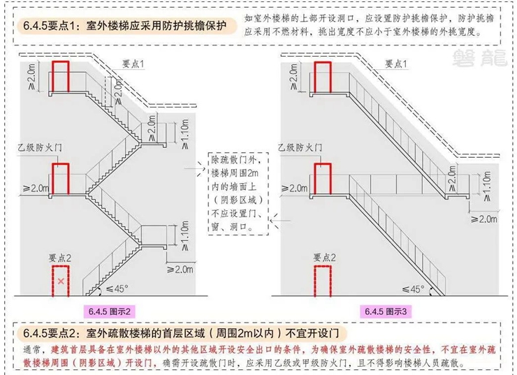 《<建筑設(shè)計防火規(guī)范>圖示及應(yīng)用》第6.4.5條示意了室外疏散樓梯的防護挑檐做法,附文末。